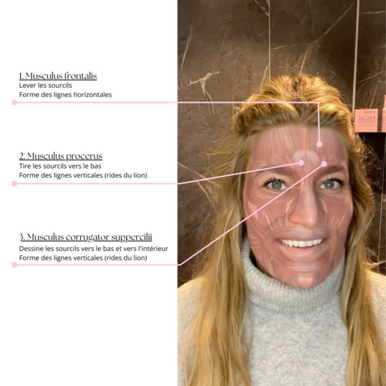 Sur le front, trois muscles sont responsables à la fois des lignes verticales et horizontales. Ils travaillent ensemble, et lors de l'expression d'émotions telles que la colère, la tristesse ou la réflexion, il arrive souvent que plusieurs muscles soient sollicités simultanément.