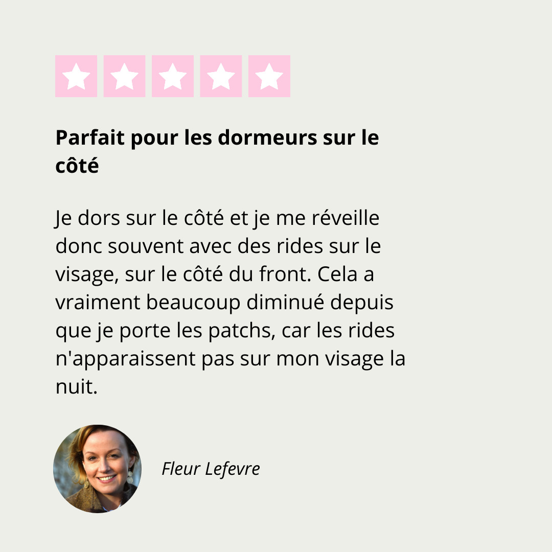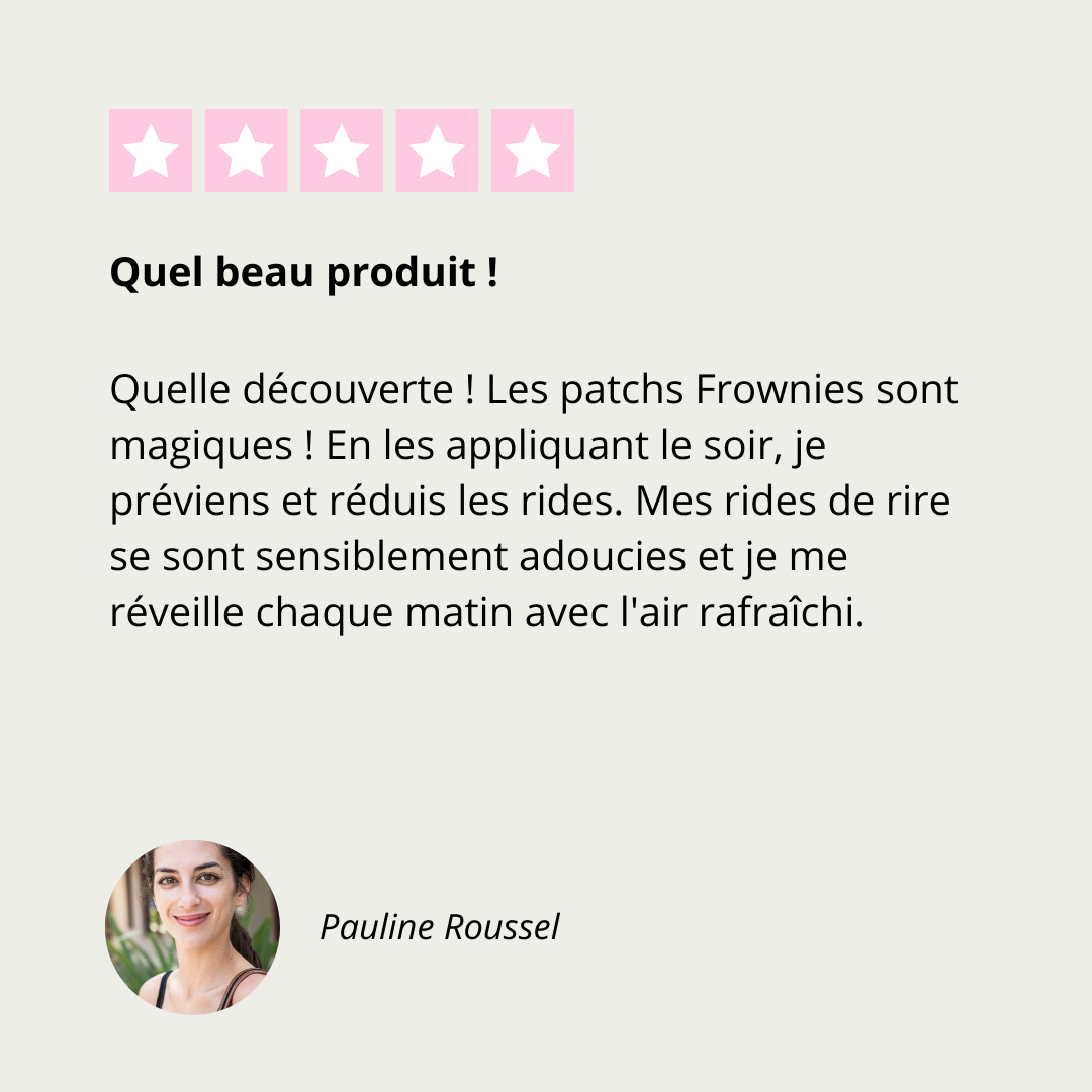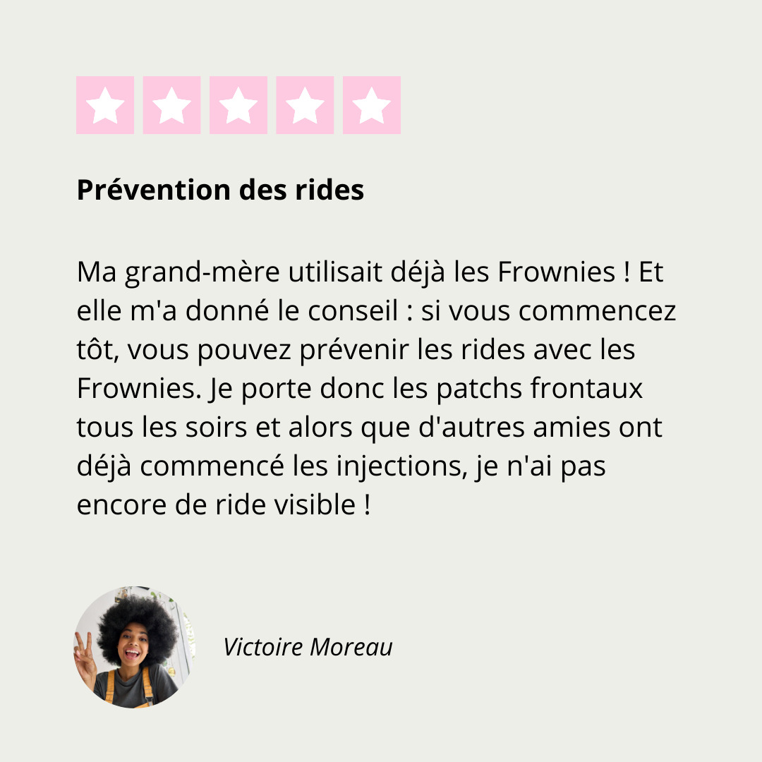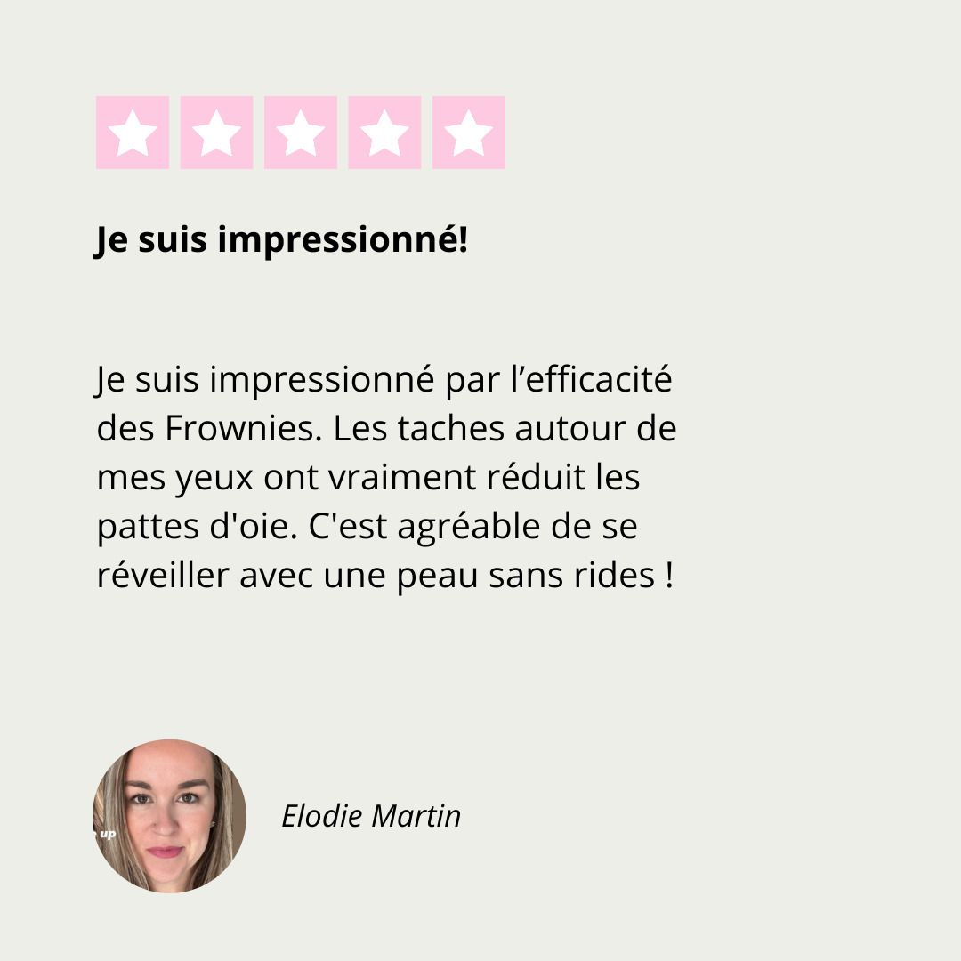 Les rides se forment en raison de la contraction de vos muscles. En portant les patchs faciaux Frownies pendant votre sommeil, vous pouvez uniquement détendre les muscles sous les patchs. Les patchs agissent comme un plâtre pour une jambe cassée. En les humidifiant avant utilisation, ils deviennent durs et permettent uniquement la détente des muscles. Le résultat : une peau avec moins de rides et de fines lignes.
