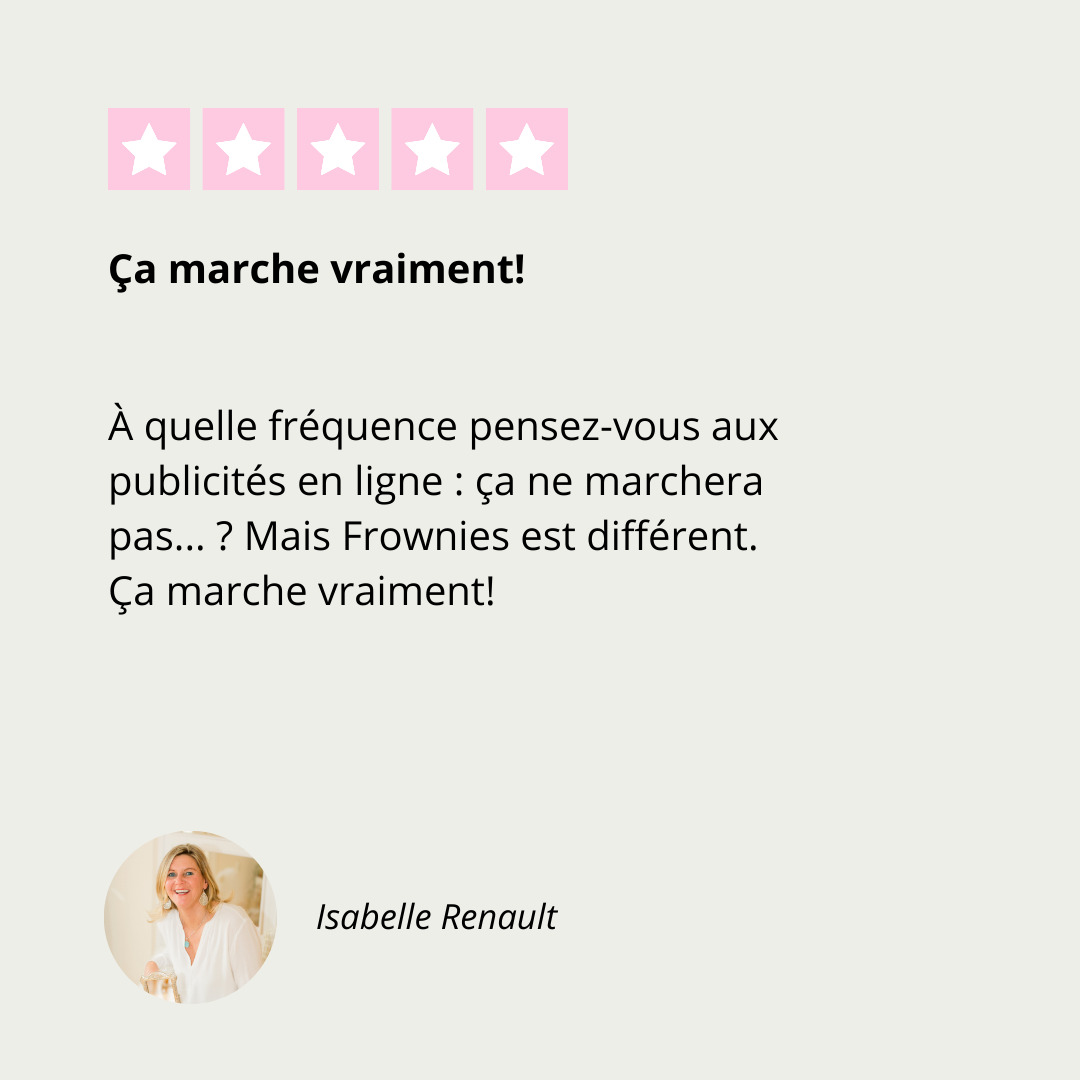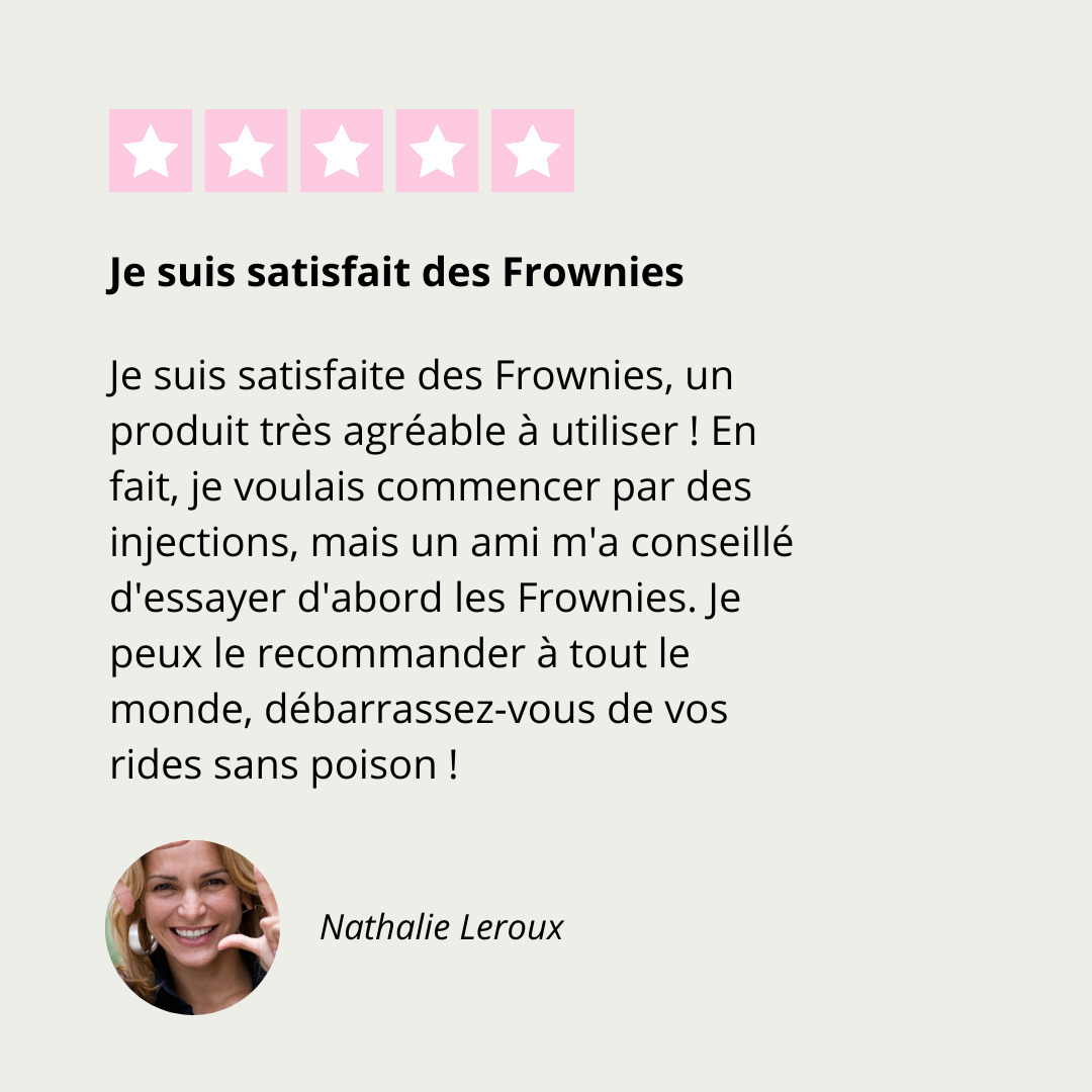 Linda a commencé à vendre les Frownies en France en tant que distributeur officiel en 2019. Avant de créer Frownies.fr, elle cherchait elle-même une solution naturelle pour ses premières rides de froncement. Elle a lu plusieurs articles sur la réduction des rides en anglais, français et espagnol, et au cours de ses recherches, elle a trouvé de nombreuses critiques positives sur les Frownies. Il y avait juste un problème : ils n'étaient pas disponibles en France. Grâce à une ancienne collègue qui partait en voyage aux États-Unis, elle a réussi à obtenir une boîte. Après une nuit, elle était convaincue : sa ride de froncement était moins profonde et elle se réveillait sans maux de tête ! Elle s'est dit que plus de gens en France devraient connaître cela, et c'est ainsi que Frownies.fr a vu le jour. Depuis, nous avons étendu nos activités en Belgique, et Linda utilise toujours les patchs chaque nuit.